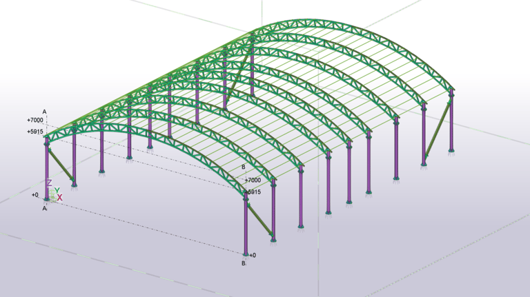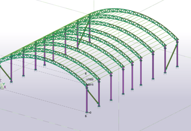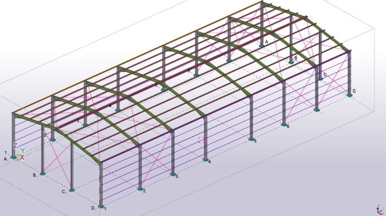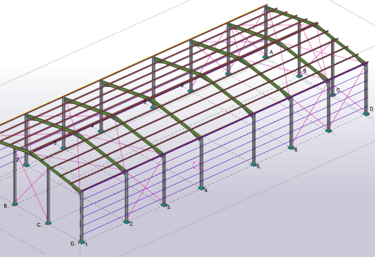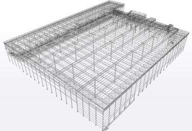 Modelado, planos de corte, conjuntos y montaje en Tekla de una nave industrial de gran superficie.
