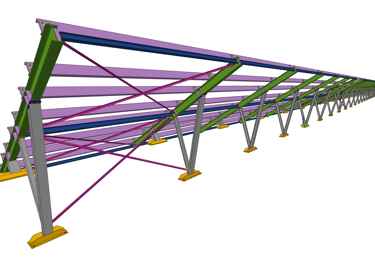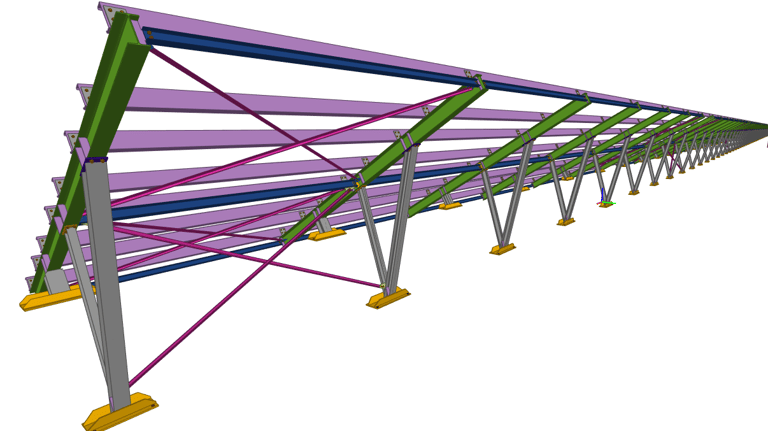 Modelado y generación de planos en Tekla de estructural metálica para soporte de paneles solares.