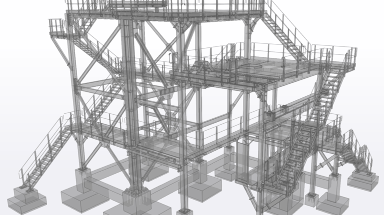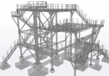 Modelado y planos en Tekla de estructura de plataforma industrial.
