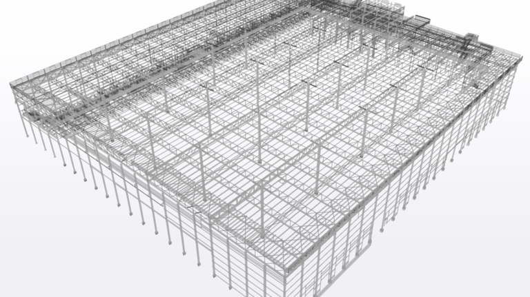 Modelado de nave industrial en Tekla Structures, con generación integral de planos y archivos para fabricación en taller.